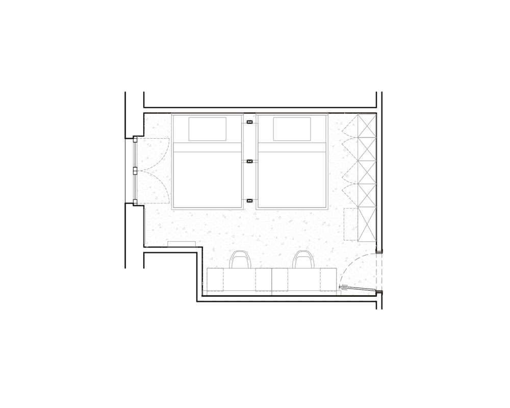 Stanza da letto per due ragazze, precedentemente dotata di due letti a soppalco: il progetto mira ad ottenere da un unico ambiente due aree letto private ma in continuità, entrambe dotate di un letto alla francese. Un divisorio/libreria consente di fungere da comodino per entrambi i letti, addossati ad esso, e di far permeare la luce in tutta la stanza. La parete scrivania, l’angolo selfie e l’armadio con toeletta per il trucco completano lo spazio.