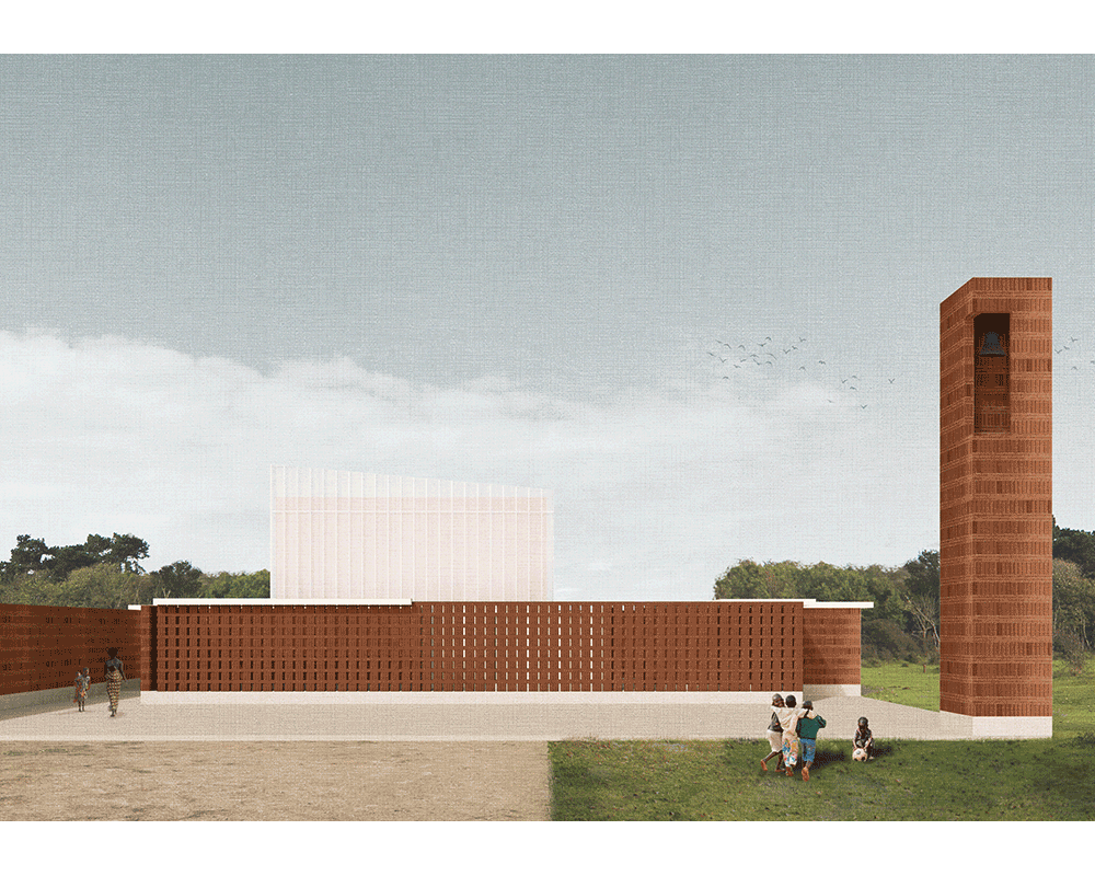 Bellezza selvaggia e temporali frequenti, la Rainwater Chapel è situata nel tipico paesaggio collinare della Rwanda e si prefigura come un edificio guida per i fedeli: l’edificio accoglie e riceve i fedeli smarriti fisicamente nella radura e concettualmente nella fede. Si protegge dalla natura circostante e un percorso interno, costituito da semplici muri in mattoni, guida il fedele attraverso spazi di preghiera, caratterizzati da “rainscapes” costituiti da specchi d’acqua riempiti dalle piogge, e verso il paesaggio in sé, visibile dalle aperture verso la natura circostante, come una propria rivelazione della fede. Il volume dell’aula, ricoperto da pannelli di metallo bianchi, si impone sul paesaggio circostante come un nuovo landmark.